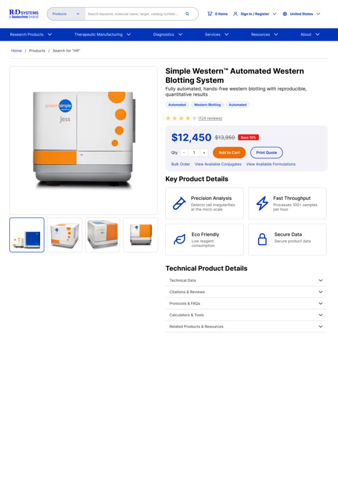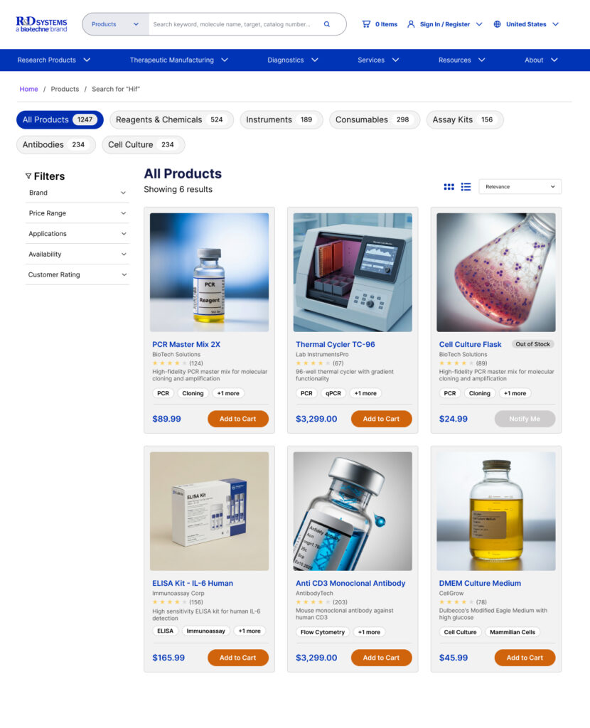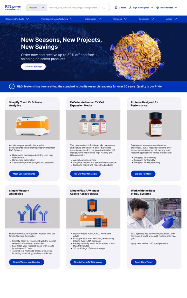 The previous R&D Systems site was built before mobile responsiveness became a web standard, resulting in a layout optimized solely for desktop users. While this met the needs of most customers at the time, who primarily accessed the site from laboratory or office environments, it increasingly became a limitation as mobile usage grew. Users seeking quick access to product details, data sheets, or research materials on the go often found the site difficult to navigate on smaller screens. This lack of mobile optimization not only impacted usability but also limited the site’s overall accessibility and perceived modernity, emphasizing the need for a fully responsive design that adapts seamlessly across devices.